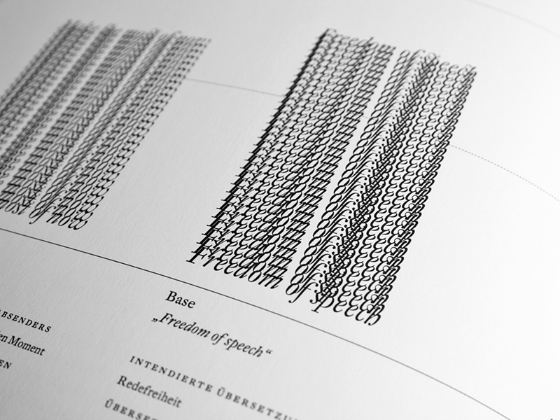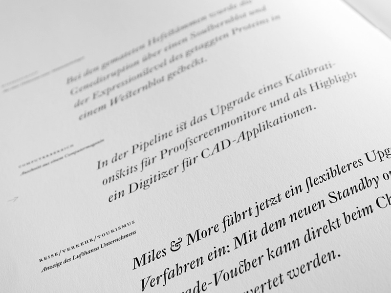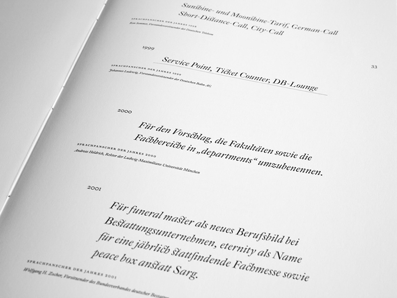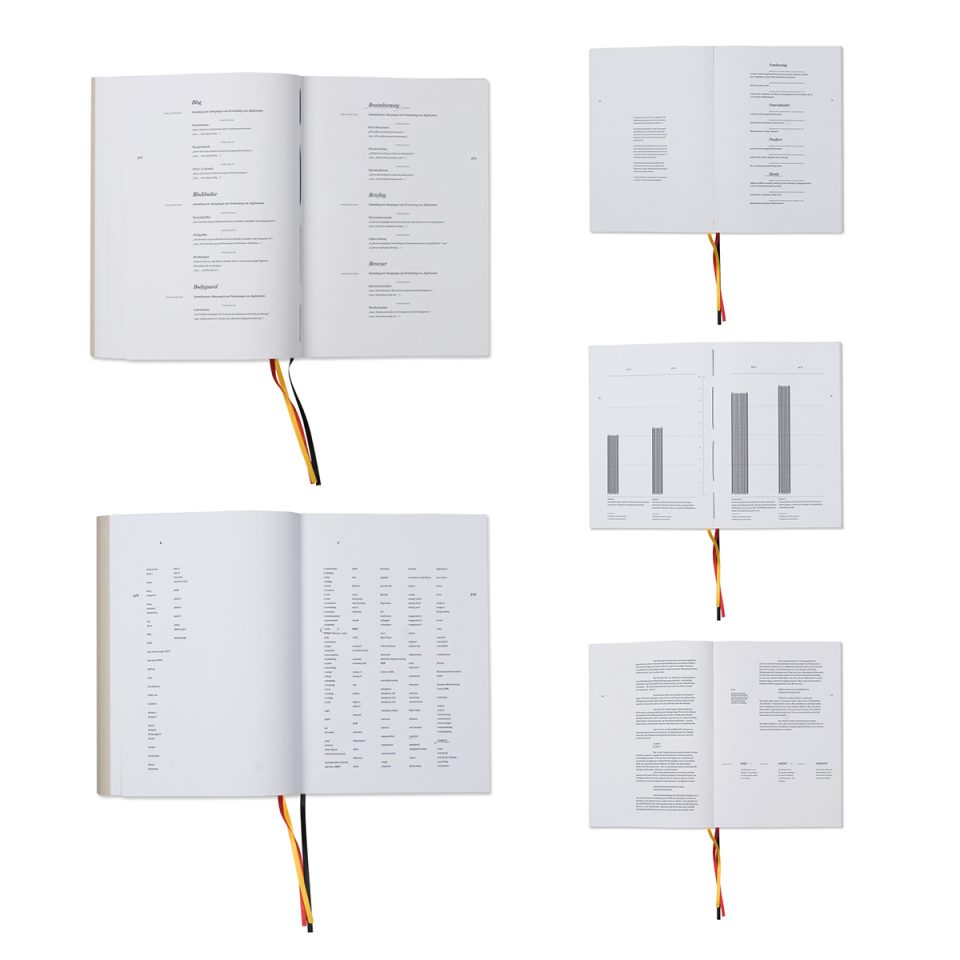 Das Buch wurde mit einer offenen Fadenheftung plus 3 farbigen Lesebändchen gebunden. Als Veredelung wurd der Titel blindgeprägt und der Untertitel mit einer Heißfolienprägung versehen. Die verwendeten Schriften sind die DTL Argo sowie die DTL Fleischmann, beide vertrieben von der Dutch Type Library.